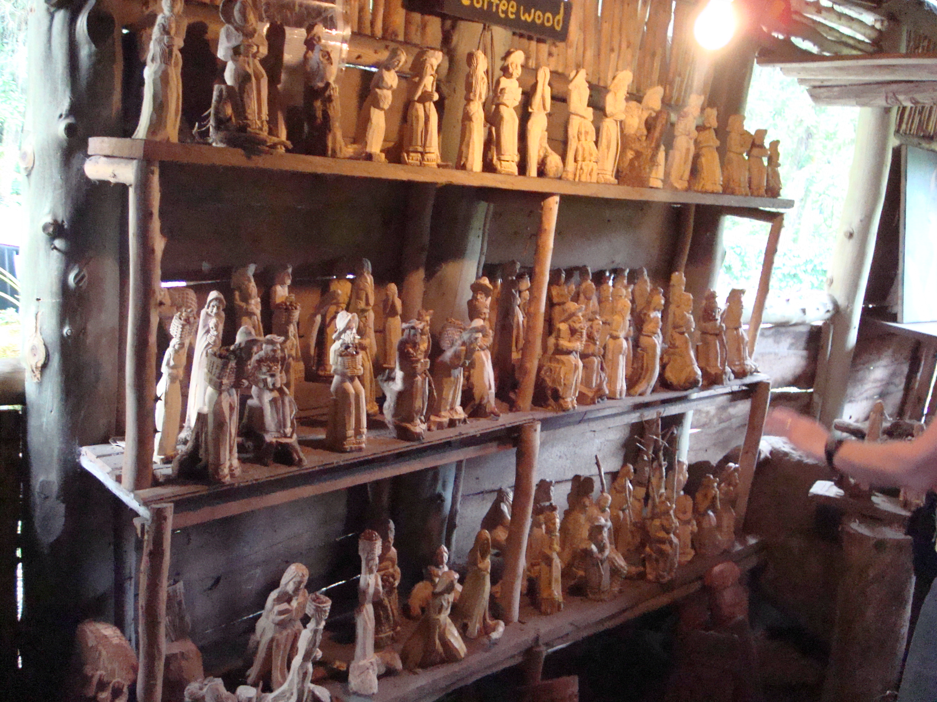 It’s entirely possible some would give the place a once-over and decide to stay in the car. Perhaps they’d think I am too easily impressed. I, however, believe there’s beauty in the unpretentious. I don’t need to walk into a spacious, air-conditioned studio to see art worth appreciating. This artist used the resources available (in his case, lots of coffee wood) in his area and never once set foot in a gigantic Michael’s or Hobby Lobby, yet was 100 times more productive than most people who spend way over $100 on supplies for a new hobby they may end up growing weary of shortly after. He took the inanimate, natural form of wood and shaped it into hundreds of people, campesinos mostly, that he either knew or imagined who looked just as full of life as the people that inspired the carvings. Looking at the carvings’ faces, I would venture to say he really loved his work; that’s why, though it’s true it provided an income for him, I believe his work is art for art’s sake. He just wanted to create, and to do so, must pay the bills. I don’t think someone who didn’t enjoy carving would have etched the Last Supper on the walls of their workplace, do you?