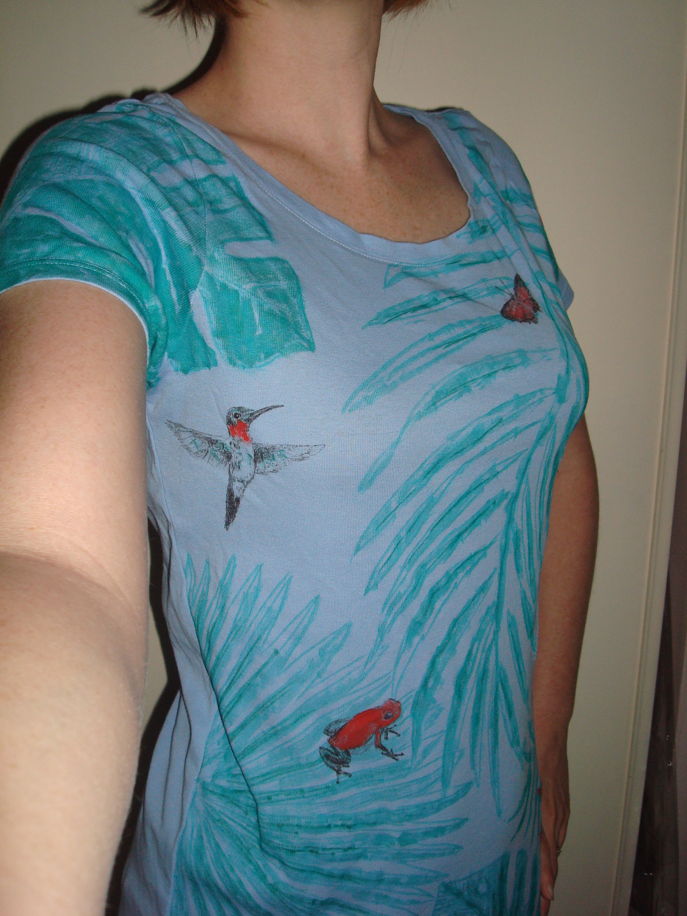 When I should have been packing one morning, I decided I needed to rescue a shirt.  I stained it the first time wearing it during a very long car ride in which I ate a chocolate bar and didn’t notice a little chunk of it melting in the folds.  This makes me sound like a big slob.  Oh well, I’m human.  Then, while attempting to remove the stain I ended up somehow putting two lightened spots elsewhere on the shirt.  But I JUST bought it and it was so comfy and fit just right!!  I had this big green paint marker I’d gotten at a thrift store (new in the package!) and wanted to take a shot at designing something to wear, since I really couldn’t ruin it any more. 🙂