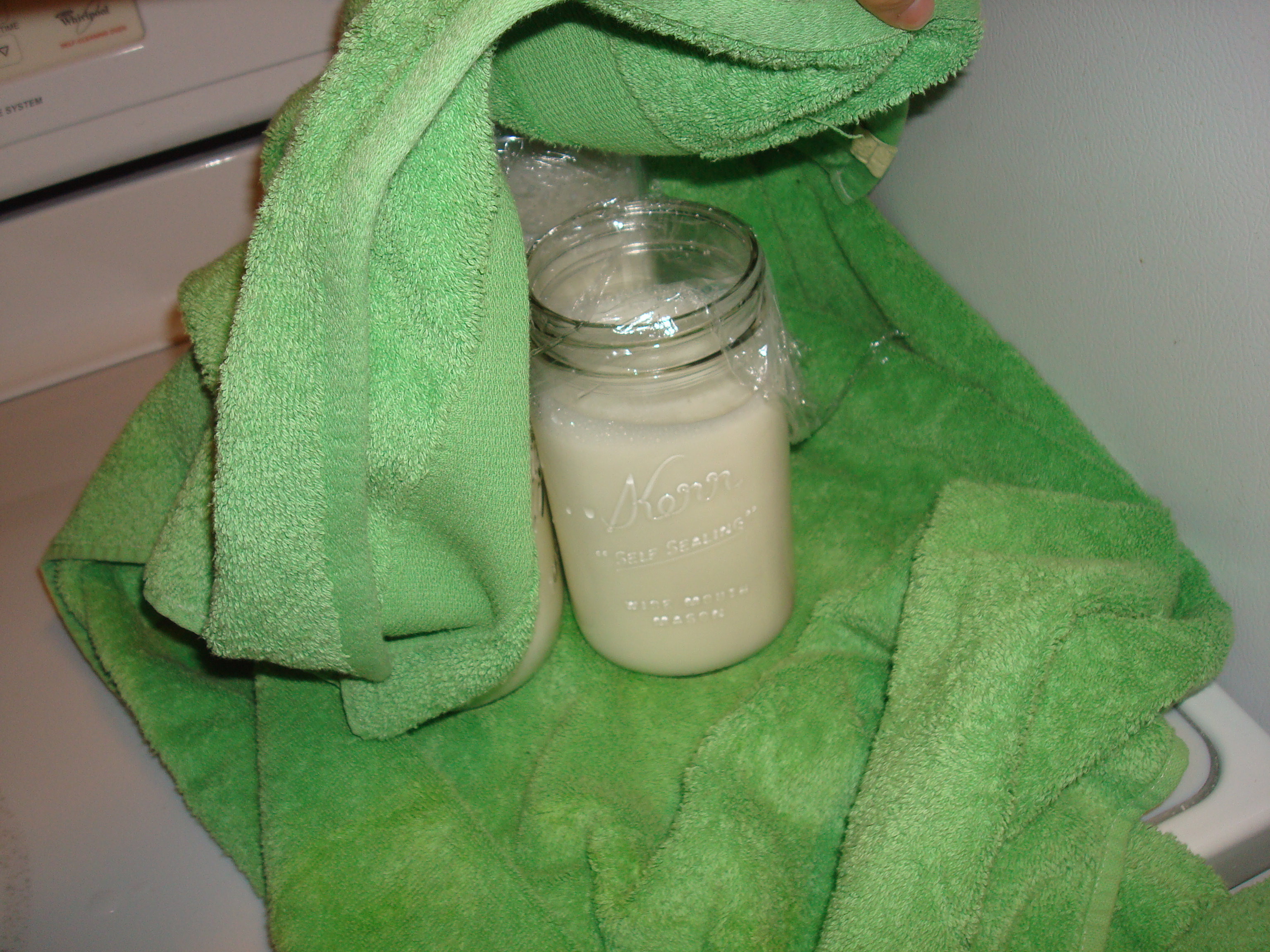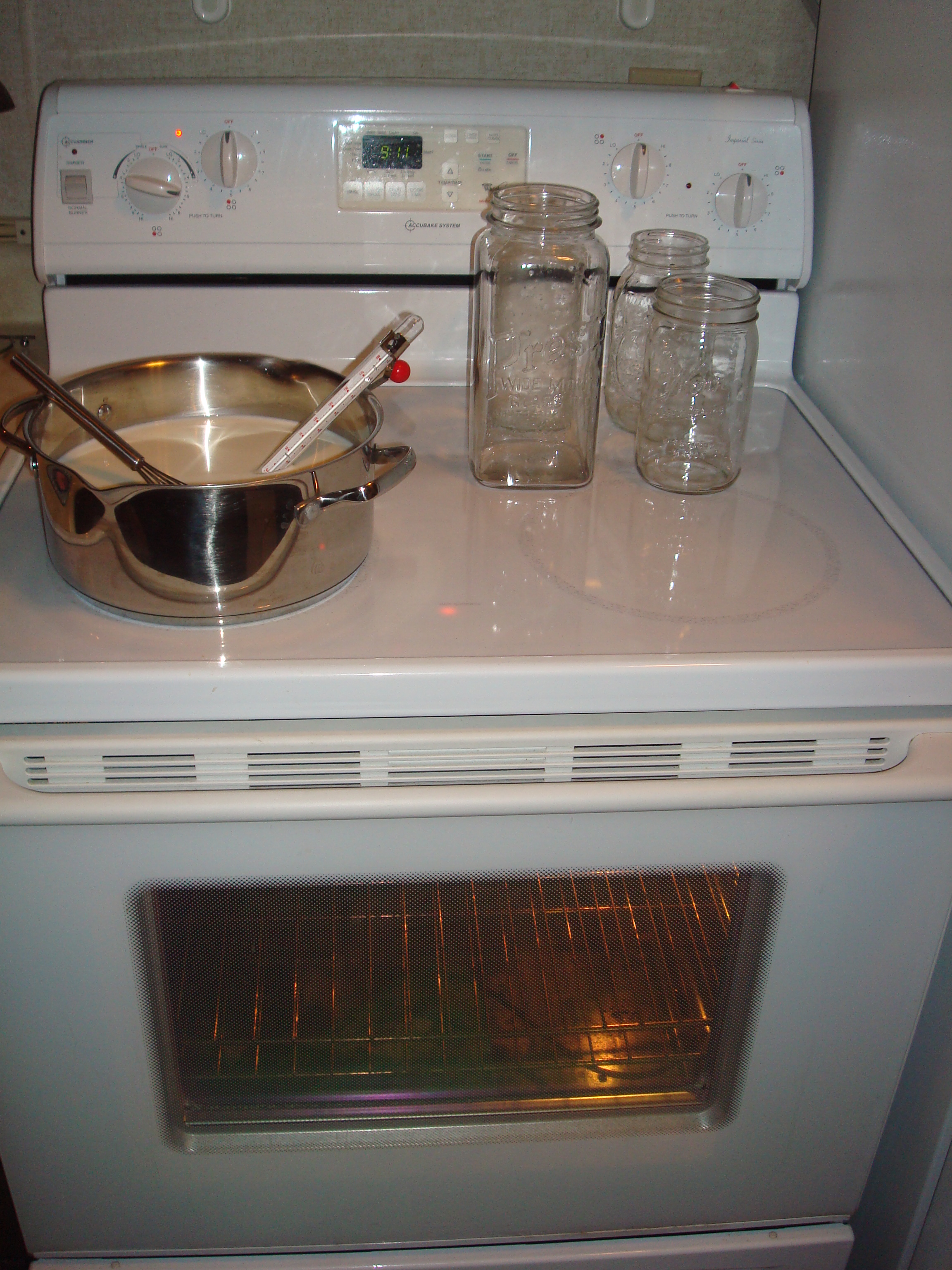 1. Prepare supplies: 1/3 c. plain yogurt, whole milk, plastic wrap, candy thermometer, big pot, metal whisk, glass jars big enough for the amount of milk I’m cooking, a cookie sheet with a towel on top for wrapping in the oven to keep warm, sink filled with ice water.