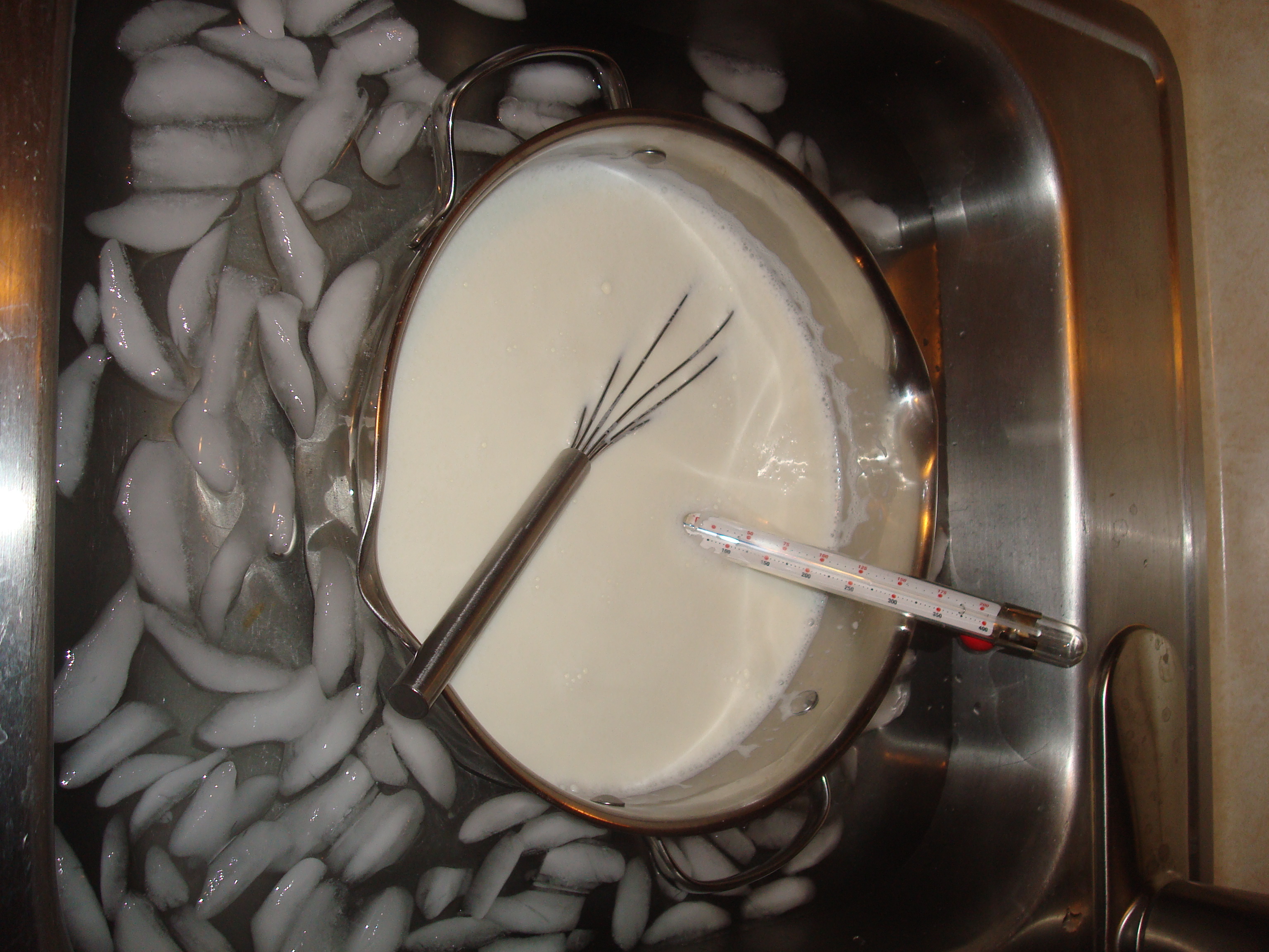 3. Cool the milk quickly down to 115 degrees by floating the pan in the sink filled with ice water.  This takes a few minutes  and you’ll want to stir occasionally and watch it, ready to pull it out before it goes below that temperature.