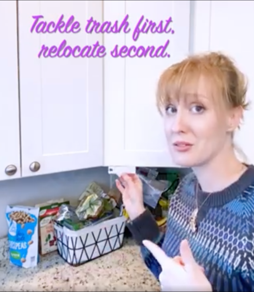 The easiest way to start and make a dent is by removing what doesn’t belong: trash and misplaced items. Bread clips always end up on my counters, and stale, unsealed things I forgot about need to go!